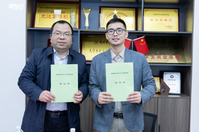 座谈尾声,签约与授牌仪式正式举行。左飞与卢维共同签署《实习就业基地合作协议》,并代表学院向盐城新东方教育文化发展有限公司授予“实习就业基地”牌匾。