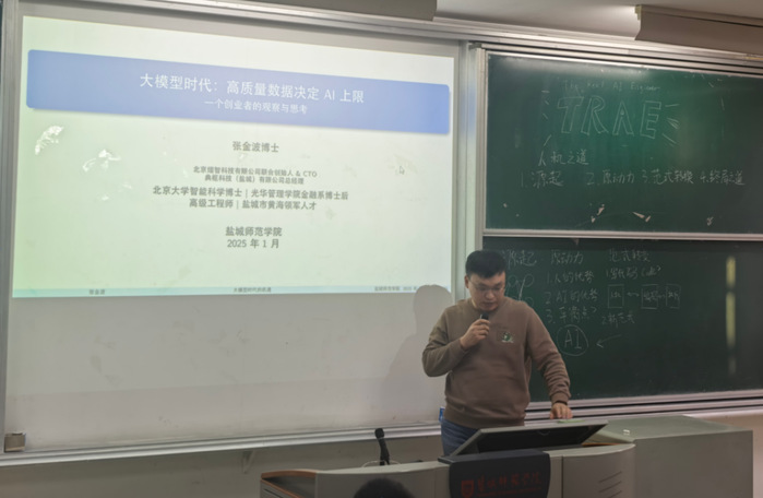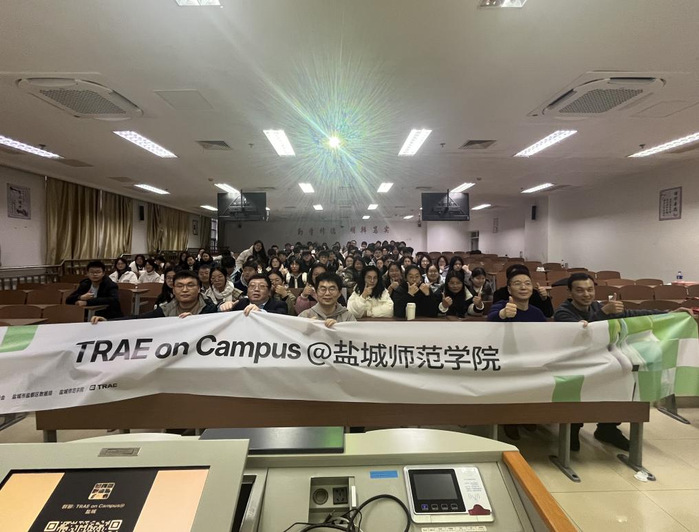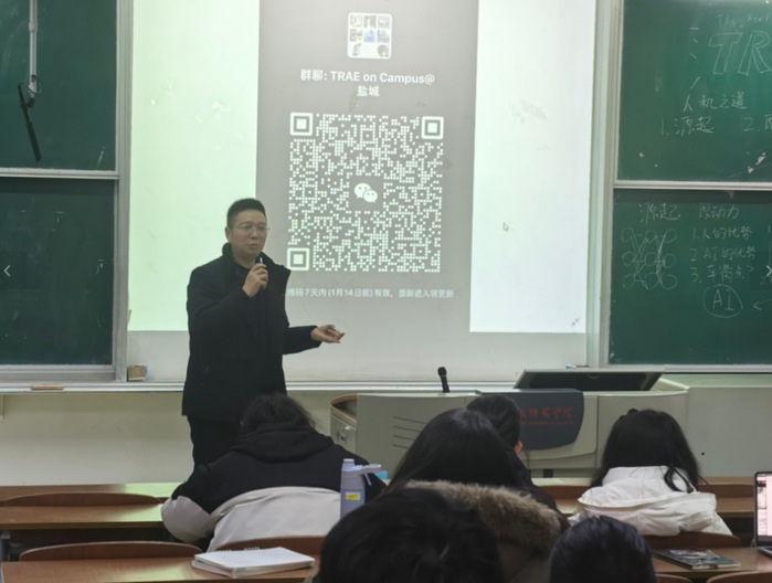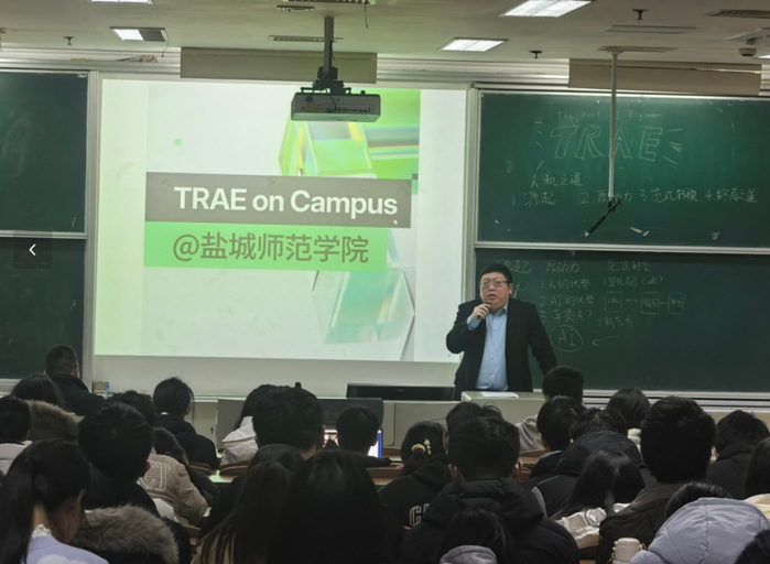 1月7日下午,“TRAE校园行,智创未来”主题活动在通榆校区主楼B103教室成功举办。本次活动由盐城高新区管委会、盐城市盐都区数据局、云顶国际yd888联合主办,TRAE(字节跳动旗下AI编程产品)提供技术支撑。来自学校各专业近百名师生参加了活动。